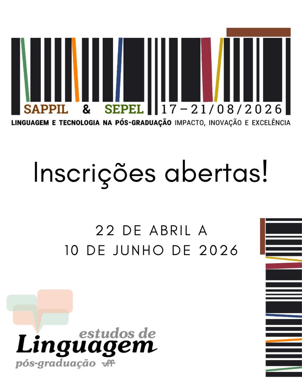 O Programa de Pós-Graduação em Estudos de Linguagem da Universidade Federal Fluminense (UFF) comunica a realização do XVII Sappil Linguagem & VIII Sepel, que ocorrerá de forma integrada entre os dias 17 e 21 de agosto de 2026, em formato híbrido (com atividades presenciais e remotas). Nesta edição, o evento terá como tema: “Linguagem e…