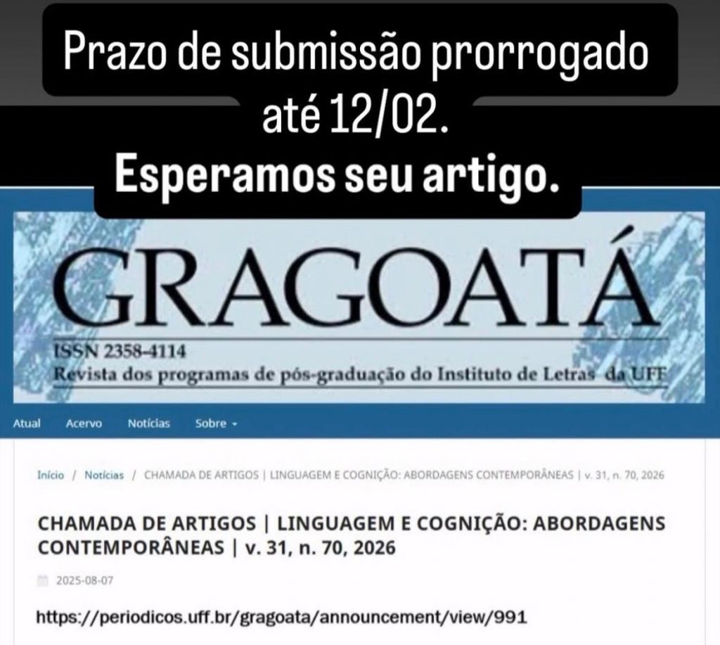 Está prorrogado, até o dia 12 de fevereiro, o prazo para submissão de artigos inéditos para Gragoatá nº 70. Mais informações em https://periodicos.uff.br/gragoata/announcement/view/991 LINGUAGEM E COGNIÇÃO: ABORDAGENS CONTEMPORÂNEAS Este número temático tem como foco a linguagem sob a perspectiva cognitiva e dedica-se à publicação de pesquisas originais que explorem a complexa articulação entre a linguagem…