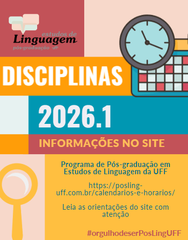 | Programa de Pós-Graduação em Estudos da Linguagem UFF – Universidade Federal Fluminense Instituto de Letras R. Prof. Marcos Waldemar de Freitas Reis, s/nº Campus do Gragoatá, Bloco C Sala 518 Niterói, RJ | CEP 24210-201 |